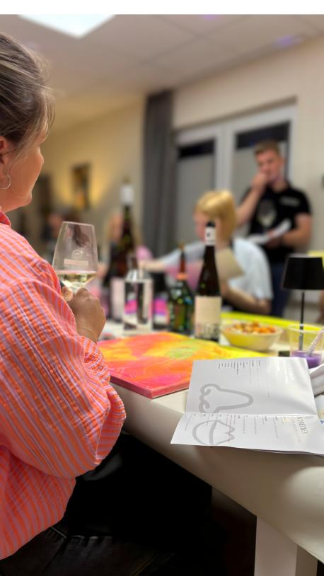 Begleitet wird der kreative Teil von einer Auswahl aus fünf verschiedenen Weinen, die perfekt auf den Abend abgestimmt sind. Für das leibliche Wohl sorgen zudem Snacks und passende Weingläser, die selbstverständlich bereitstehen.